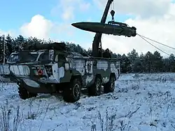 OTR-21 Tochka (Russian: оперативно-тактический ракетный комплекс (ОТР) «Точка», romanized: operativno-takticheskiy raketnyy kompleks (OTR) "Tochka", lit. 'Tactical Operational Missile Complex "Point"') is a Soviet tactical ballistic missile. Its GRAU designation is 9K79. Its NATO reporting name is the SS-21 Scarab. One missile is transported per 9P129 vehicle and raised prior to launch. It uses an inertial guidance system.[3][4]