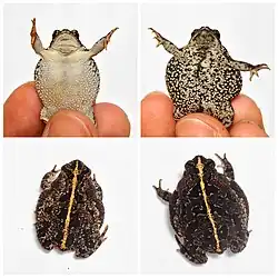 The oak toad can be identified by its light mid-dorsal stripe, variable brown and black spots, and proportionally large parotoid glands. One of the most remarkable features of this species is its small adult size relative to other toads.