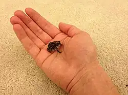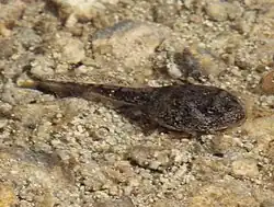 Eggs develop quickly, hatching in a mere 24 to 36 hours.[5] The tadpole reaches a maximum length of 18 to 19.4 mm (0.71 to 0.76 in). It is grayish olive or grape-green dorsally and purplish ventrally. The tail has 6 or 7 black saddle marks.[11][12] The tadpole completes metamorphosis into a juvenile toadlet in 4 to 6 weeks, and it reaches adulthood and sexual maturity at 1.5 to 2.3 years of age.[5] The length of the lifespan is unclear.[3] There are records of specimens living for four years in captivity,[9][11] and the reported average lifespan in captivity is 1.9 years.[14]