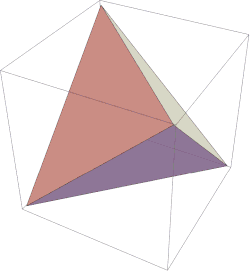 - ^ The three incompletely orthogonal great squares which intersect at each vertex of the 16-cell form the vertex's octahedral vertex figure.[d] Any two of them, together with the completely orthogonal square of the third, also form an octahedron: a central octahedral hyperplane.[g] In the 16-cell, each octahedral vertex figure is also a central octahedral hyperplane.