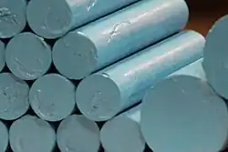 Oil sticks or oil bars are an art medium. Oil sticks are oil paint in a stick form similar to that of a crayon or pastel. Oil sticks are made by blending the oil and pigment with wax and pouring it into molds to form an oil stick.[1] It is distinguished from oil pastels in that a drying oil such as linseed oil is used as the main binder whereas oil pastels use a non-drying oil as the primary binder.[2] Oil sticks can be used interchangeably with traditional oil paints to produce drawings, paintings, and sketches. Popularized in the 1980s by such artists as Jean-Michel Basquiat, oil sticks have become much more common in contemporary oil painting in recent years.
