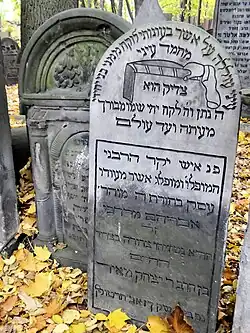 In 1806 Warsaw's Jewish Commune petitioned the government to establish a new cemetery for Jewish inhabitants of Warsaw.[2] The Bródno Jewish Cemetery, in existence since 1769, was nearly at capacity and the chevra kadisha sought a new burial ground.[3] The lot chosen was located right outside of the city limits in the borough of Wola, next to a new Catholic Powązki Cemetery established in 1790. The petition was accepted and in the following year the cemetery was established. The earliest headstone was dated December 6, 1806 and belonged to certain Nachum son of Nachum of Siemiatycze, but it did not survive to our times. The first woman interred there was certain Elka Junghoff, daughter of Jehuda Leib Mulrat of Kalisz. Her tombstone is dated November 26, 1804, but the date is most likely wrong. Hence the oldest surviving headstone belongs to Sara, daughter of Eliezer (died September 8, 1807).[4]