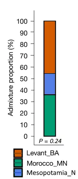 Most of the genome of the Nuwayrat individual (about 78%) derived from Neolithic North African ancestry, specifically matching samples from the Moroccan site of Skhirat-Rouazi (SKH, dated to 4780–4230 BCE).[2] This seems to reflect shared Neolithic ancestry across North Africa during this period, and its specific genetic contribution to the Early Dynastic and Old Kingdom people.[2] However this shared Neolithic North African ancestry itself has been previously shown to be a combination of Levant Neolithic ancestry for about 76%, probably reflecting one or several pre-Bronze Age Levantine migration events, and Iberomaurusian ancestry for about 24%.[2]