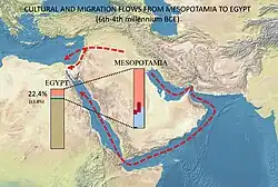 The timing of the admixture event cannot be calculated directly from the 2025 genetic study.[18] The 2025 study showed that the Nuwayrat sample had the greatest affinity with samples from Neolithic Mesopotamia dating to 9000-8000 BCE (composed of individuals from Nemrik 9, Boncuklu Tarla and Çayönü, from the Pre-Pottery Neolithic A and Pre-Pottery Neolithic B periods).[11][18] Concurrently, other studies have shown that during the Neolithic, in the 10,000-5,000 BCE period, populations from Mesopotamia and the Zagros expanded into the Near-East, particularly Anatolia, bringing with them the Neolithic package of technological innovation (domesticated plants, pottery, greater sedentism). Egypt may also have been affected by such migratory movements.[18][20] Futher changes in odontometrics and dental tissues have been observed in the Nile Valley around 6000 BCE.[18] Subsequent cultural influxes from Mesopotamia are documented into the 4th millenium (3999-3000 BCE) with the appearance of Late Uruk features during the Late Pre-dynastic period of Egypt.[18]