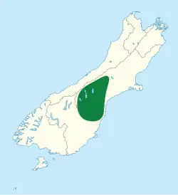 | Distribution of the scree skink on a map of the South Island Known native range | |