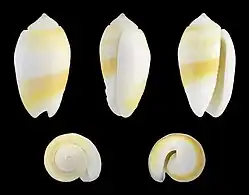 This is a small species, ranging from 10–28 mm.[3] The spire is low and the shell has a relatively squat appearance. Typical shells are mostly orange, yellow, or russet with lighter bands. Some forms may feature patterning like that found on many other olive species.