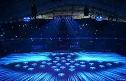 - 2014: ballet dancers holding strands of blue LEDs danced on the shape of a dove projected on the stadium floor.