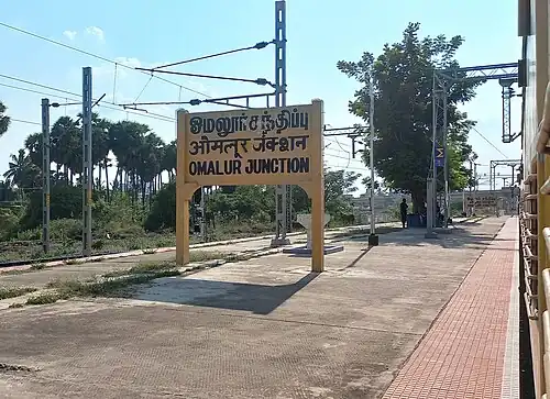Omalur Junction railway station (station code: OML) is an NSG–6 category Indian railway station in Salem railway division of Southern Railway zone.[1] It is a railway junction serves Omalur and its surrounding areas in Salem, Tamil Nadu. This railway junction also serves as a satellite station for Salem Junction. All the trains halting/passing via Salem Junction from Bengaluru and Mettur stop at Omalur Junction. This station lies on the junction of lines to Bengaluru via Dharmapuri and Hosur and Mettur.