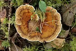 Coltricia perennis is similar, but has a weakly circularly zoned, bare cap. The flesh of the cap is stained uniformly. Other species of Coltricia and Phaeolus are also similar.[2]