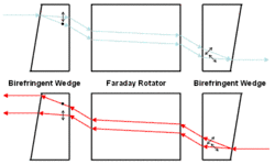 The polarization independent isolator is made of three parts, an input birefringent wedge (with its ordinary polarization direction vertical and its extraordinary polarization direction horizontal), a Faraday rotator, and an output birefringent wedge (with its ordinary polarization direction at 45°, and its extraordinary polarization direction at −45°).[6][7]