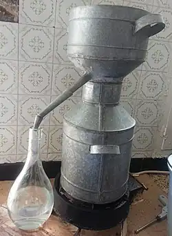 Orange blossom water serves two purposes in the Maghreb: one usage is as a perfume or freshener, usually given to guests to wash their hands upon entering the host house or before drinking tea. It is put in a special silver or metal container, recognizable in the typical Maghrebi tea set. This old custom is fading away. It is still common in Algerian cuisine, Tunisian cuisine, and Moroccan cuisine, especially as an ingredient for traditional sweets and sometimes to aromatize drinks such as coffee.[6] In Algeria, orange blossom water is also used to reduce the sensation of heat and to soothe sunburns, especially when applied to the head as a cooling remedy. In Argentina, which borrows a lot of culinary traditions from Italy, agua de azahar is used to add a particular aroma and flavor to pan dulce, the traditional panettone prepared during year end celebrations.