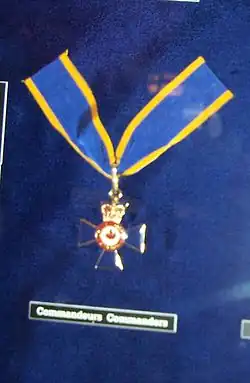 The badges for inductees are of a similar design to the sovereign's badge, though without precious stones, and slight differences for each grade. For Commanders, the emblem is gilt with a red enamel maple leaf in the gold central disk; for Officers, it is gilt with a gold maple leaf; and for Members, both the badge itself and the maple leaf are silver. The reverse bears only a serial number,[3] and all are topped by a St. Edward's Crown,[18] symbolizing that the order is headed by the sovereign. These insignia are worn with the order's ribbon, which is blue with golden edges.[2][3] Commanders wear the badge at the neck while Officers and Members display theirs on the left breast on a medal bar, suspended by, respectively, a bar of gold or silver decorated with a laurel motif. Women in civilian dress may wear their emblems on a ribbon bow pinned at the left chest. The ribbon bar, worn for undress, is the same for each grade, save for a miniature blue cross pattée with a maple leaf, the colour of which matches that on the badge of the grade that the wearer was appointed to;[18] someone who has been promoted within the order may wear on their ribbon bar the pins of all grades that they have occupied. These same miniatures also serve as a lapel pin for civilian wear.[19]
