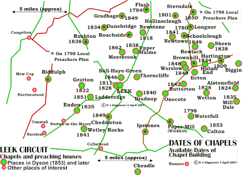 The diagrammatic map of the Leek area shows the number of "preaching stations" and chapels in existence during the 18th and 19th centuries, both Wesleyan and Primitive. (This is not exhaustive, but shows information at the time of drawing.) Some of the places were cottages or farmhouses, and not the final location of a chapel. The diagram includes a reference to a preaching plan of 1798.[50]