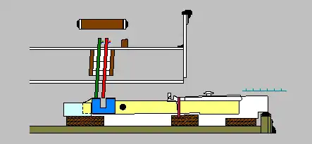 For the keys that play the near row of jacks (closer to the player), the mechanism works like this. The portion of the key that engages the lower end of the jack is U-shaped, with each prong of the U ending in a wide, flat upper surface. (This U-shaped part is shown in blue in the false-color diagrams below.) The entire keyboard mechanism can be slightly shifted toward or away from the player, using knobs at the sides of the keyboard. Depending on the location of the keyboard, the jacks will be aligned in different ways against the U, resulting in different strings being played. The three possibilities are shown in the diagrams below, which depict sounding jacks in green, silent ones in red.