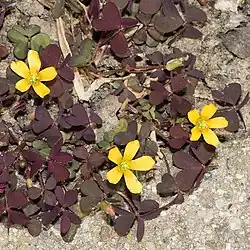 Oxalis corniculata is a small creeping type of woodsorrel that tends to grow well in moist climates.[3] It resembles the common yellow woodsorrel, Oxalis stricta.