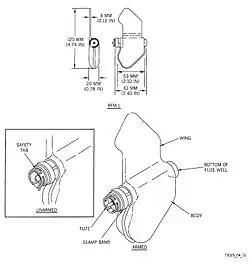 The mine consists of a polyethylene plastic container containing 37 g (1.3 oz) of VS-6D or VS-60D liquid explosive.[1][4] The two wings of the PFM-1 allow it to glide after being released in the air, then spin, stabilizing it and slowing its descent, similar to maple seeds.[5][1] The thick wing contains the liquid explosive.[5] The two wings together are 120 mm (4.7 in) long.[6] The plastic body can be produced in a variety of colours for best camouflage. As existing stocks were in European green rather than sand coloured, the first examples used in 1980s Afghanistan were green and easily visible. This led to their name 'green parrots'.[5]