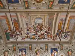 The fresco decoration of many interior rooms by Luca Cambiaso, Giovanni Battista Castello, Lazzaro Calvi and others was started between 1556 and 1566 under the commission of Gerolamo's son, Giovanni Battista Grimaldi, owner of the famous villa Grimaldi detta La Fortezza in Sampierdarena.