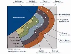 During the Gaza War, Palestinian militants began to deploy improved Qassam and factory-made rockets with a range of 40 kilometers.[84] Rockets reached major Israeli cities Ashdod, Beersheba and Gedera for the first time, putting one-eighth of Israel's population in rocket range[85] and raising concerns about the safety of the Tel Aviv metropolitan area, Israel's largest population center,[86][87] as well as the Negev Nuclear Research Center.[88] According to Israeli authorities, 571 rockets and 205 mortar shells landed in Israel during the 22 days of the conflict.[28]