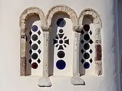 There is a demonstrable reference to Emperor Alexios in the now largely destroyed inscription Ἀλέξιος ἐν Χῶ τῶ Θῶ αὐτοκράτωρ Ρωμαίων ὁ Κομνινὸς καì πιστὸς βασιλεύς (Alexios in Christ the God [faithful], autokrator of the Romans, the Komnenos and pious basileus) over the inside of the main entrance.[13] There is also a fresco with a portrait of the Emperor, which dates from the 16th century[14] and is hence not contemporary, and is moreover badly damaged. There is a debate in the literature about whether the Alexios in question might not be Alexios II Komnenos, who ruled from 1180 until 1183. The motifs in the marble intarsia provide some support for this theory, particularly the representation of birds and the frequent use of crosses are typical of illustrated manuscripts from the time of Alexios II.[15] Evidence to the contrary comes from the fact that Alexios I demonstrably pursued a program of church building, and that neighbouring islands have churches that have been dated to the time of his rule.[16] Therefore, the foundation of the church before the emperor's death in 1118 is not excluded; various local texts that specify exact dates, are from the 19th century and probably have no factual basis.