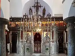The iconostasis, which separates the eastern end of the main hall of the church from the chancel (called the "bema" in Orthodox tradition), is notable for its brilliantly multicoloured effect.[2] It has the usual five-part structure. The lower part consists of the original furnishings from the construction of the church around 1100. The upper part consists of an engraved wooden post-Byzantine architrave, a frieze with fourteen icons and a carved top.[3] The variety of ornaments is considered unique in the Middle Byzantine Era, with links to the 6th century[2] and to churches in Constantinople, Venice and Ravenna.[4]