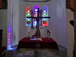 The east-facing cross-arm of the church contains the altar, and also contains a half-round apse that is recognisable from outside. The apse contains a mullion which, like the two smaller windows next to the apse, is filled with colourful glass bricks. The red, green, yellow and blue glass bricks provide the only exterior light into the chancel, that is otherwise only lit through the opened doors of the iconostasis, or through it from the inner part of the church. North of the chancel, at the Northeast side of the building, is a narrow bell-gable with four bells that can be rung from outside using bell ropes.