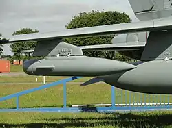 The Tornado is cleared to carry the majority of air-launched weapons in the NATO inventory, including various unguided and laser-guided bombs, anti-ship and anti-radiation missiles, as well as specialised weapons such as anti-personnel mines and anti-runway munitions.[85][86][87] To improve survivability in combat, the Tornado is equipped with onboard countermeasures, ranging from flare and chaff dispensers to electronic countermeasure pods that can be mounted under the wings.[88] Underwing fuel tanks and a buddy store aerial refuelling system that allows one Tornado to refuel another are available to extend the aircraft's range.[89]