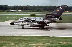 The first Tornado prototype made its first flight on 14 August 1974 from Ingolstadt Manching Airport, in West Germany.[133] Deliveries of production Tornados began on 27 July 1979. The total number of Tornados delivered to the German Air Force was 247, including 35 ECR variants.[134] Originally Tornados equipped five fighter-bomber wings (Geschwader), with one tactical conversion unit and four front-line wings, replacing the Lockheed F-104 Starfighter.[135] When one of the two Tornado wings of the German Navy was disbanded in 1994, its aircraft were used to re-equip a Luftwaffe's reconnaissance wing formerly equipped with McDonnell Douglas RF-4E Phantoms.[136]