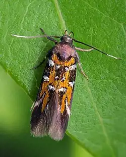 This article incorporates text from this source, which is in the public domain. Keys and description - ^ Koster, J.C. & Sinev, S.Yu., 2003. Momphidae, Batrachedridae, Stathmopodidae, Agonoxe nidae, Cosmopterigidae, Chrysopeleiidae. - In P. Huemer, 0. Karsholt and L. Lyneborg (eds): Microlepidoptera of Europe 5: 1-387. ISBN 87-88757-66-8 ISSN 1395-9506