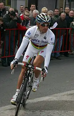 Bartoli fell heavily on a knee in 1999 and Bettini was freed to race for himself.[4] He won Liège–Bastogne–Liège in 2000 – treating himself to a €100,000 Porsche[1] – and a flat stage of that year's Tour de France, from Agen to Dax. He won the 2001 Züri-Metzgete after a few months without wins, beating Jan Ullrich in the sprint to the finish. His success led to a feud with Bartoli. It culminated in the 2001 world championship in Lisbon, Portugal, where Bartoli refused to lead Bettini to a flying start in the sprint finish and the Spaniard, Óscar Freire, won instead.