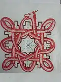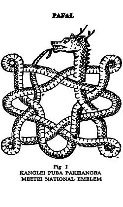 A Paphal, also spelled as Pafal (Meitei: ꯄꯥꯐꯜ), or Paphan or Pafan (Meitei: ꯄꯥꯐꯟ), is a Meitei traditional symbolic representation, resembling pythons,[a] varying in shape and color. These illustrations are closely linked to Meitei cosmology, mythology, clan identity, and ritual practices of traditional Meitei religion (Sanamahism) of Manipur.[1][2][3] Notably, the Paphal Lambuba (Meitei: ꯄꯥꯐꯜ ꯂꯝꯕꯨꯕ), a traditional illustrated manuscript, contains depictions of 364 Paphals.[4][5]