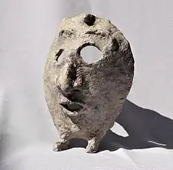 In 20th-century France, papier-mâché was used in the performing arts, whether to make Noh theatre masks, or masks for the play for Compère le Renard,[60] a one-act farce by Georges Polti (1867-1946), created before the First World War (Guy-Pierre Fauconnet, 1920). Georges Lafaye (1915-1989) also built up a collection of puppets over the course of the century, some in papier mâché.[61] This material is also used in the decorative arts, for example by Catherine David to create the frame of a large papier-mâché mirror with mirror marquetry (1970s). More recently, artists such as Gilles Jonemann, with his brooch in white coral and papier mâché,[62] and Christian Astuguevieille[63] have introduced papier mâché into jewellery design. Sculptors also used it, whether Jean-Jules Chasse-Pot in works such as Homme au lévrier or Jean Dubuffet, in the 1960s, who experimented with papier mâché in sculptures such as Bouche en coup de sabre[64] and Fruits de terre.[65] His use of this material reflects his exploration of so-called 'poor' materials to create raw, singular forms.
