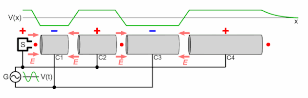 Linear high-energy accelerators use a linear array of plates (or drift tubes) to which an alternating high-energy field is applied. As the particles approach a plate they are accelerated towards it by an opposite polarity charge applied to the plate. As they pass through a hole in the plate, the polarity is switched so that the plate now repels them and they are now accelerated by it towards the next plate. Normally a stream of "bunches" of particles are accelerated, so a carefully controlled AC voltage is applied to each plate to continuously repeat this process for each bunch.