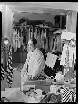 Duke Ellington in the mirror of a dressing room at Paramount Theatre Manhattan (1946)Dressing rooms: Rooms where cast members apply wigs, make-up and change into costumes. Depending on the size of the theatre, there may be only a male and female dressing room, or there might be many (i.e. one for each member of the cast). Often in larger spaces, cast members in lead roles have their own dressing room, those in supporting roles share with one or two others and those in the background or "chorus" roles share with up to 10 or 15 other people. Dressing rooms generally feature a large number of switchable outlets for accessories like hair dryers, straightening irons, and curlers. They also feature mirrors, which are often lit. Sinks are present for the removal of makeup and sometimes a dressing room will have showers and restrooms attached. Lockers, or costume racks are generally used for storage of costumes. In some performances, dressing rooms are used as a secondary green room because of space limitation or noise, especially by performers with long breaks between stage appearances.