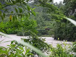 In Ecuador, there are very few bridges across the Pastaza. The most significant ones are in Tungurahua province - namely a large span over the exact point of headwaters, just north of Baños, and the secondary span created by the Agoyán dam. After this, bridges tend to be of the suspension type, suitable for foot or small vehicle passage only. However, it is notable that the Pastaza can be forded during the dry season in a 4x4 truck, going across the floodplains below the town of Mera.