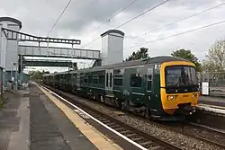 The station is on a rough north–south alignment, curving towards the west at the north end.[1] There are two platforms, separated by two running lines and connected by an open footbridge.[7][8] Platform 1, on the east side of the station and adjacent to the Up Tunnel track, is for trains towards Filton Abbey Wood and Bristol Parkway. Platform 2, on the west side and adjacent to the Down Tunnel track, is for trains towards Pilning. Both platforms are 121 metres (132 yd) long, and the tracks have a speed limit of 90 miles per hour (140 km/h).[9] The line through Patchway has a loading gauge of W8, and handles over 15 million train tonnes per year.[10] The line through Patchway has recently been electrified as part of the 21st-century modernisation of the Great Western Main Line.[11]