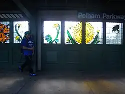 In 1976, with funding from the Exxon Corporation, this station, as well as three others citywide, received new "artfully humorous graffiti" murals and artwork.[13] Local designer Peter Bradford Associates received $5,000 to repaint the station and put "16 bright posters of animals and parts of animals" on each platform wall, in the theme of the nearby Bronx Zoo.[13]