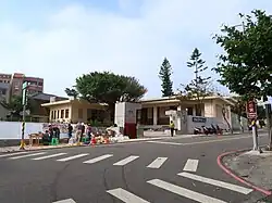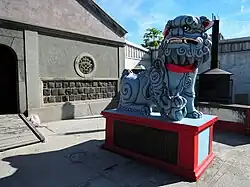 Two guardian lions, one male and one female, now stand in the plaza of Penghu Guanyin Temple. Made of grey plaster mixed with glutinous rice paste, they originally stood in front of the Qing-era the administrative office of the Penghu Naval Garrison, completed in 1887. The Penghu Naval Headquarters was completed in 1887. After the Japanese takeover in 1895, the building served as the first Hōko Prefecture Hall (Penghu County Hall). [23]