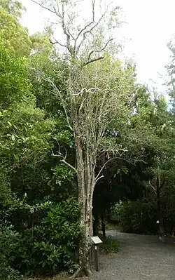 An English name is "duck's foot", coming from the shape of the juvenile plant's leaf.[2] Juvenile plants have small leaves with tangled, divaricating stems, while mature plants have much larger leaves and a normal tree architecture.