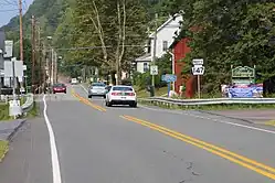 PA 147 begins an interchange with the US 22/US 322 freeway south of the Clarks Ferry Bridge over the Susquehanna River in Reed Township, Dauphin County. Within this interchange, the highway crosses the Appalachian Trail, which uses Clarks Ferry Bridge across the river. From this interchange, the route heads northeast on two-lane undivided South River Road between the Susquehanna River to the northwest and Norfolk Southern's Buffalo Line and forested Peters Mountain to the southeast. The road passes through the community of Inglenook and heads north away from the mountain, passing over the railroad tracks. PA 147 continues north through wooded areas to the east of the Susquehanna River and the Norfolk Southern line, turning east away from the river and railroad tracks and curving northeast into a mix of farm fields and woodland with some homes. The route crosses into Halifax Township and continues through rural land with some development, curving east and coming to an intersection with PA 225. At this point, PA 147 turns northeast to become concurrent with PA 225 on Peters Mountain Road. The road gains a center left-turn lane and heads north through rural areas of homes and businesses. The two routes continue into the borough of Halifax and become South 4th Street, losing the center left-turn lane and passing several homes. PA 147 splits from PA 225 by heading west on Market Street through residential areas. The route turns north onto North 2nd Street and leaves Halifax for Halifax Township again, passing more development before becoming North River Road and running through fields to the east of the Susquehanna River and the Buffalo Line. The road bends northwest and continues through a mix of farmland and woods with some homes and commercial development to the east of the river and railroad tracks. PA 147 heads to the west of forested Berry Mountain and enters Upper Paxton Township, curving to the northeast.[3][4]