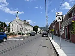 PA 16 enters the Cumberland Valley and heads into agricultural areas before it passes near residential subdivisions. The road crosses into the borough of Mercersburg and continues past homes before running past a few businesses. The route turns south and comes to an intersection with PA 75/PA 416, where those two routes head south for a concurrency with PA 16. The three routes follow Main Street past homes and businesses in the center of Mercersburg. The road turns southeast into residential and becomes Buchanan Trail West again, with PA 75 splitting to the south. PA 16/PA 416 continue southeast and leave Mercersburg for Montgomery Township, heading through agricultural areas. PA 416 splits from PA 16 by turning south, and PA 16 curves east and crosses the West Branch Conococheague Creek. The road continues through farmland with some woods and homes and reaches an intersection with PA 995. Here, PA 995 turns east for a concurrency with PA 16, and the two routes head into Peters Township. In the residential community of Upton, PA 995 splits to the north while PA 16 continues east-southeast through farm fields with some woods and homes, crossing into Antrim Township. The road passes near housing developments before running through more rural land with some development and curving east to cross Conococheague Creek. The route continues east and enters the borough of Greencastle, where it becomes West Baltimore Street and passes a few homes before it comes to an intersection with US 11 in a business area. Past this intersection, PA 16 crosses under Norfolk Southern's Lurgan Branch railroad line and heads into the downtown area of Greencastle, coming to a traffic circle at Carlisle Street. From here, the road becomes East Baltimore Street and leaves the downtown, passing through residential areas. The route widens to a divided highway as it comes to an interchange with I-81 in a commercial area.[3][5]