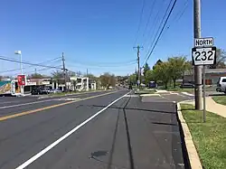After this intersection, the road narrows back to two lanes and turns northeast into residential areas, reaching a junction with Maple Avenue.[4] PA 232 makes a curve to the north as it crosses Bristol Road into Northampton Township.[7] The route turns northeast again and continues past more housing developments with a few businesses.[4] At Richboro, the road crosses Ironworks Creek and passes shopping centers and businesses as Bustleton Pike merges into Second Street Pike and PA 232 continues due north. The route widens to four lanes and passes more commercial development as it crosses PA 332 (Almshouse Road/Newtown Richboro Road).[4][7] Following the PA 332 junction, the road narrows to two lanes and passes more residential areas, with Worthington Mill Road branching to the northeast.[4] As the route approaches the Sacketts Ford Road intersection, the settings become more rural as the road passes near farms and woods with some homes.[4][7]