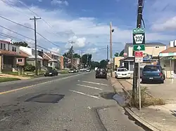 After passing the naval facility, Oxford Avenue continues northeast at the intersection with Robbins Street/Martins Mill Road and crosses Levick Street.[5] PA 232 runs north through the residential Lawncrest neighborhood and reaches the Five Points intersection with PA 73 (Cottman Avenue) and Rising Sun Avenue in the Burholme neighborhood. From this junction, the route passes a mix of urban residential and commercial establishments as it comes to a bridge over CSX's Trenton Subdivision railroad line at the Bleigh Avenue intersection and reaches a junction with Verree Road. PA 232 continues into the Fox Chase neighborhood, crossing SEPTA's Fox Chase Line at-grade south of its terminus at the Fox Chase station.[4][5] The route heads into the downtown area of Fox Chase and passes east of SEPTA's Fox Chase Bus Loop before coming to the Rhawn Street intersection, where the road makes a turn to the northwest.[4][5]