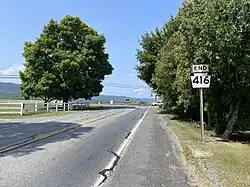 When Pennsylvania legislated routes in 1911, the present alignment of PA 416 was not assigned a number.[4] PA 416 was designated in 1928 to run from PA 16 in Mercersburg northeast to US 30 west of St. Thomas along a paved road.[5] By 1930, the current alignment of the route between the Maryland border and PA 16 east of Mercersburg was an unnumbered, unpaved road.[6] PA 416 was extended south from Mercersburg to the Maryland border southeast of Welsh Run in 1937, following its present alignment.[7][8] The entire length of the route was paved in the 1930s.[8]