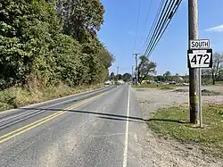 Pennsylvania Route 472 (PA 472) is a north–south state highway in Chester and Lancaster counties in Pennsylvania. Its southern terminus is at PA 841 in Lewisville 300 yards (270 m) north of the Maryland border. Its northern terminus is at PA 372 in Quarryville. PA 472 is a two-lane undivided road that passes through mostly rural areas along a northwest-southeast alignment. The route passes through the borough of Oxford, where it intersects the southern terminus of PA 10 and has an interchange with U.S. Route 1 (US 1). PA 472 was originally designated in 1928 between US 1/PA 12/PA 42 in Oxford and PA 372 in Quarryville. The route was extended south to Hickory Hill by 1930, at which time the entire length of the route was paved. The southern terminus of PA 472 was extended to PA 841 in Lewisville in 1937.