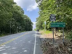 PA 915 begins at an interchange with I-70 in Brush Creek Township, Fulton County, heading northeast on two-lane undivided Crystal Springs Road, after sharing a brief concurrency with Old 126. The road winds through a mix of farmland and woodland with some homes. At Akersville, the route turns north and winds through more rural areas. PA 915 heads northeast through agricultural areas before turning north and heading into wooded areas with some homes, reaching an intersection with US 30. At this point, the route turns east to form a concurrency with US 30 on Lincoln Highway, heading into Buchanan State Forest. PA 915 splits from US 30 by turning north onto North Valley Road, passing through more of the state forest, passing to the west of Sideling Hill. The road curves to the northeast and passes over I-76 (Pennsylvania Turnpike), crossing into Wells Township. The route winds north through more forests before heading into agricultural areas and turning to the northwest. PA 915 passes through more farmland with some homes, running near Wells Tannery before heading through a mix of farms and woods and passing through a gap in Rays Hill.[2][3]
