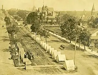 Streetcar travels past State militia encampments in the Palafox Street median.