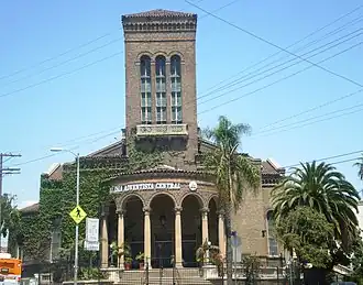 By 1972, the Temple called Redwood Valley the "mother church" of a "statewide political movement".[65] From the start, the Los Angeles facility's primary purposes were to recruit members and to serve as a waystation for the Temple's weekly bus trips across California.[65] The Temple set up permanent staff in Los Angeles and arranged bus trips there every other week.[65] The substantial attendance and collections in Los Angeles helped support the Temple's inflated membership claims.[65] The Los Angeles facility was larger than San Francisco's.[65] Its central location at the corner of Alvarado and Hoover Streets permitted easy geographic access for a large black membership from Watts and Compton.[65]