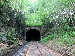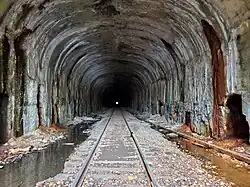 The Pequabuck Tunnel, also known as the Terryville Tunnel, is a railroad tunnel in Plymouth and Pequabuck, Connecticut. It is located on a still-active segment of the Hartford, Providence and Fishkill Railroad used by freight trains running between New Britain and Waterbury. Although locally known as the Mile Long Tunnel, the Pequabuck Tunnel is just 3,580 feet long – 0.68 miles.[1][2] The tunnel is 32 feet wide and 26 feet tall, with regularly spaced recesses in the walls to allow a person to seek safety while a train passes.[1]