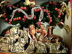 Florentino's eldest son Nicario Jiménez was born 1957 in a village in Alcamenca, near Ayacucho city.[4] The artist has produced traditional pieces in the past, but has shifted his emphasis to innovative unique themes,[76] such as cityscapes of New York or Miami.[4] He also features culturally iconic items familiar to Peruvians such as the coca leaf in a crucifix piece, or the pet and cuisine ingredient guinea pig (cuy) in a shaman retablo.[4] His Pishtaco (Pistaku) scenes, while part of traditional Peruvian lore, is not standard theme for a devotional retablo.[77][78]