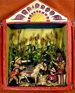 López Antay's San Marco boxes (billed as "retablos"), would feature scenes incorporating indigenous culture, in what was part of the indigenista movement.[63] The artist incorporated such scenes as suggested by his clientele circle: the collector Bustamunte, her brother-in-law anthropologist-novelist José María Arguedas, and painter José Sabogal Diéguez who were strongly influencing and help shaping the emerging retablo style.[9][64] There is thus the image of marketplace-driven art.[65] Using Huancavelica jail as backdrop for a passion scene was purportedly suggested by the painter Sabogal,[9] but López himself recalls such piece as verbally requested by Bustamunte; the bullfight was another request; he also made threshing scenes, cockfighting, and tuna gathering scenes that entered her collection.[66]
